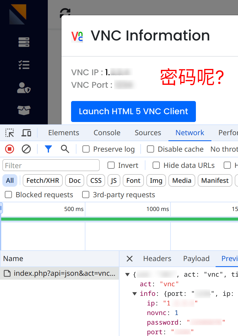 使用浏览器的开发者工具可以看到 VNC 密码