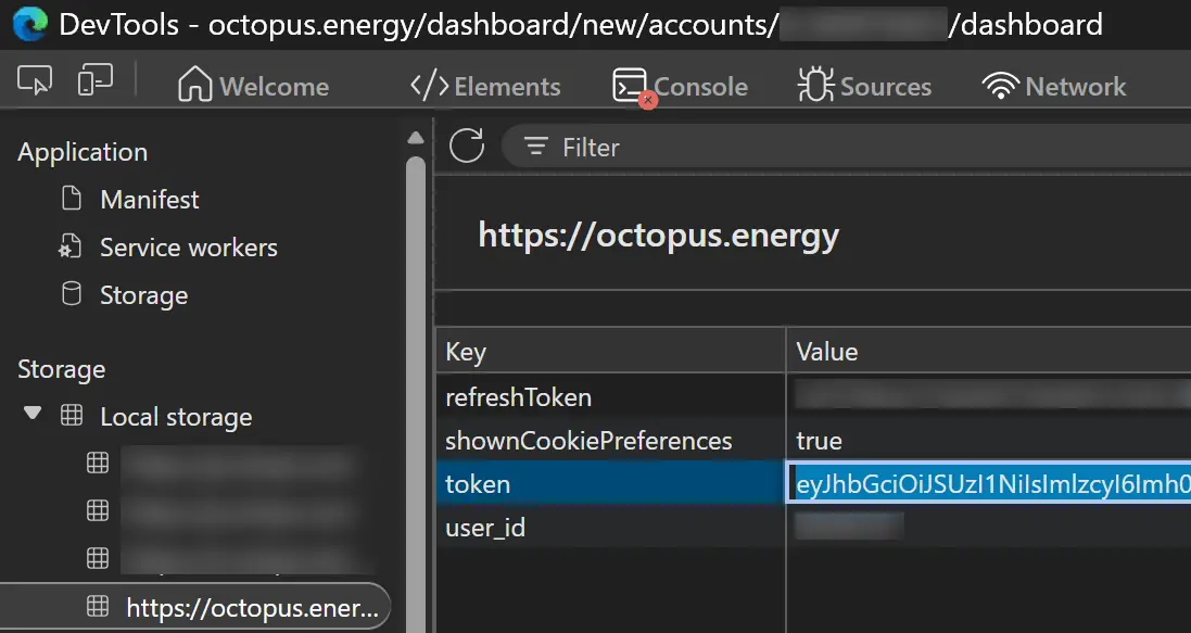 打开浏览器的开发者工具(按下 F12 打开),切换到 Application 标签页 → Local Storage → https://octopus.energy,找到名为 token 的项,复制它的值(通常为 eyJhbG... 开头的字符串):